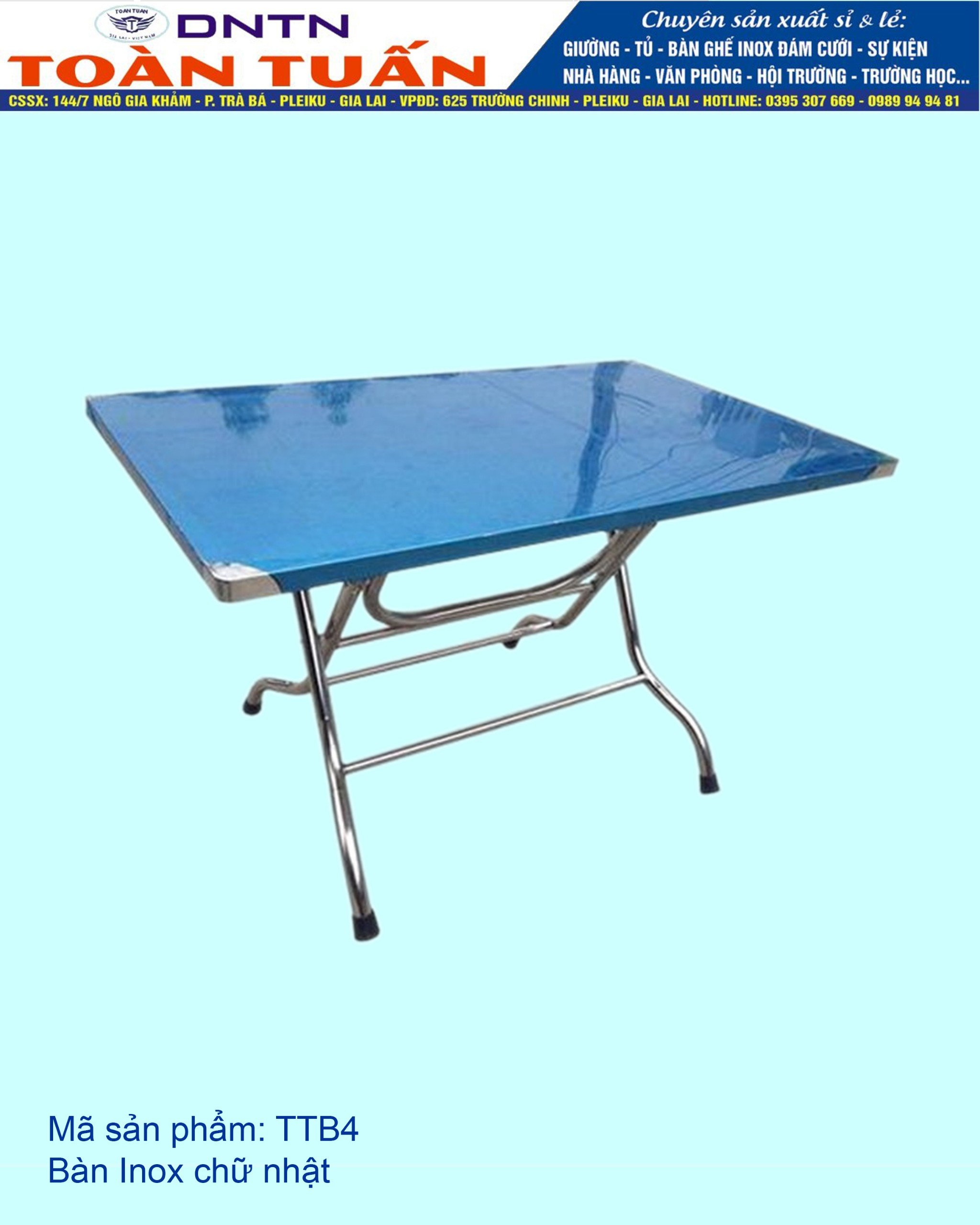 Nếu đang có nhu cầu cần tìm địa chỉ bán bàn inox chữ nhật bền đẹp, chất lượng tốt với giá rẻ, các bạn vui lòng liên hệ đến DNTN Inox Toàn Tuấn theo số điện thoại: 0395 307 669 để được tư vấn thêm thông tin và nhận bảng báo giá chi tiết sản phẩm. Ngoài ra, chúng tôi còn hỗ trợ dịch vụ giao hàng tận nơi cho những khách hàng tại Gia Lai và ở các tỉnh thành khác trên toàn quốc. Để tham khảo thêm thông tin về các loại bàn inox bền đẹp, có chất lượng tốt với giá rẻ khác mà DNTN Inox Toàn Tuấn đang cung cấp, mời các bạn xem thêm Tại Đây. Xin cảm ơn!